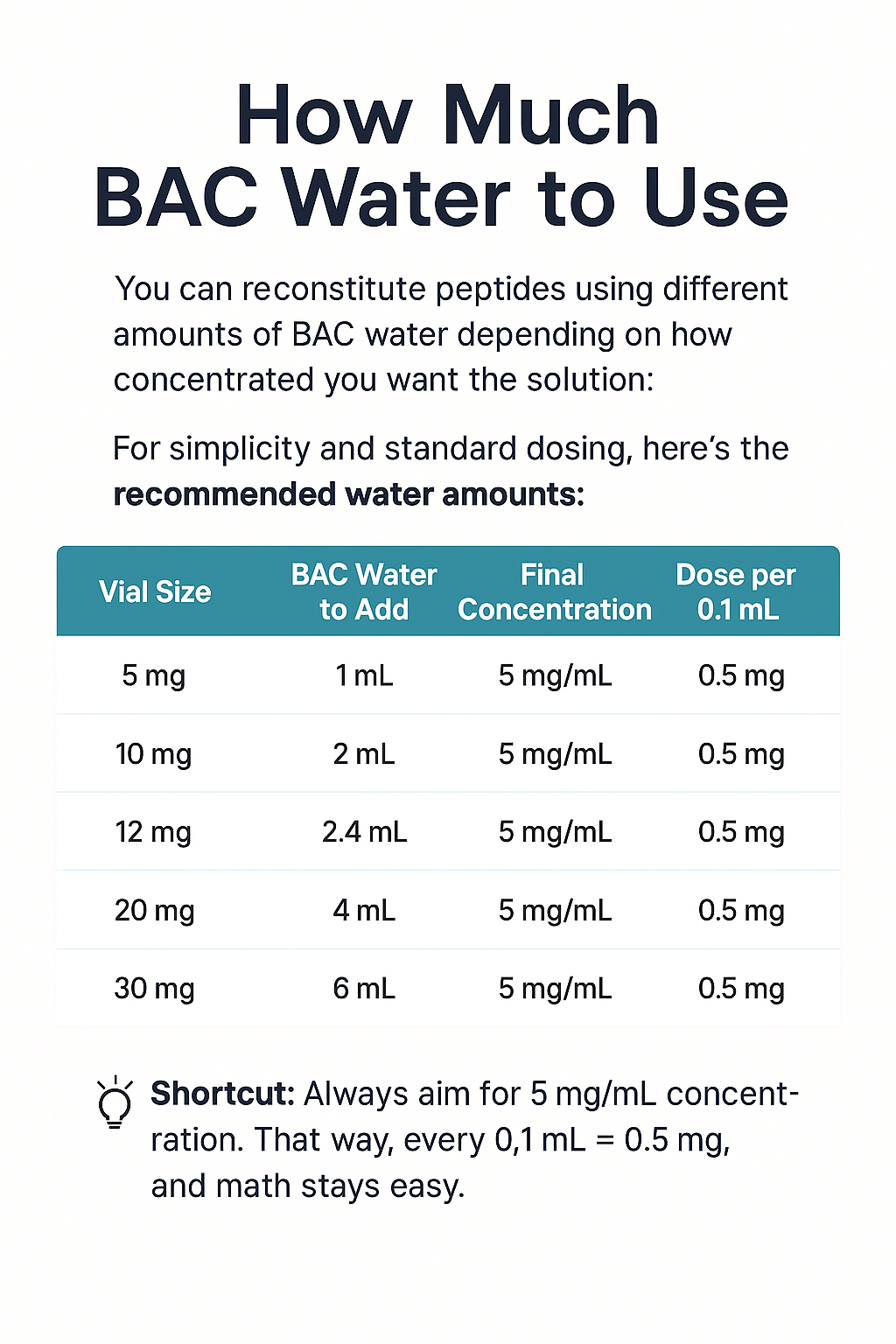 Without BAC water, peptides cannot be used effectively since they remain in their dry, powdered state. Using the correct amount of BAC water ensures: