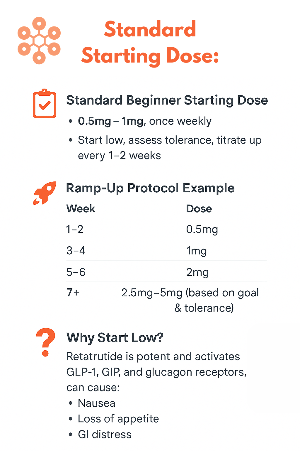 Start your Retatrutide journey safely and effectively with this simple guide. Beginning with a low dose helps minimize side effects like nausea, appetite changes, and GI distress. Slowly titrating up every 1โ2 weeks ensures better tolerance, fewer side effects, and more consistent results. Always progress gradually to find the balance that works best for your body.